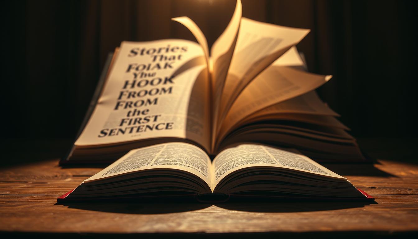 Imagine walking through a bookstore. What catches your eye? Often, it’s the first line. Like a first impression in writing, those opening words set the stage. Literary hooks don’t just start stories—they welcome readers into new worlds. A study shows 80% of readers judge books by their first line, proving opening line importance.