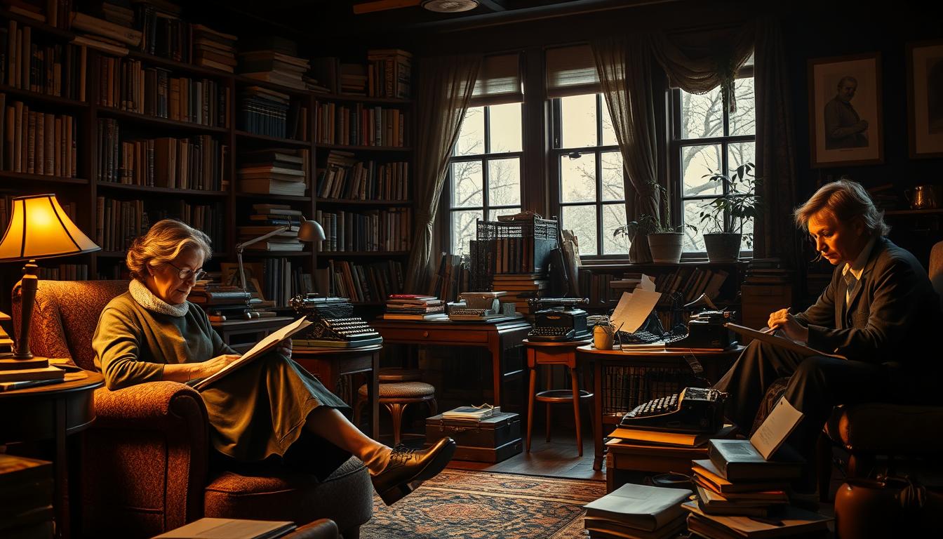 Writers often balance between writer isolation and literary collaboration. Some, like Emily Dickinson, wrote 1,800 poems alone. Others gain from author social habits. History shows writing groups like the Bloomsbury circle helped authors like Woolf.